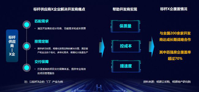 第二,聯(lián)合采購或者說與“采購聯(lián)盟”戰(zhàn)略合作,并基于此平臺實現(xiàn)與多家房企的流程對接。目前聯(lián)合采購面臨的關(guān)鍵問題是,需要建立起一個從框架協(xié)議、合同簽訂、生產(chǎn)供貨到驗收結(jié)算的一體化平臺,這樣聯(lián)合采購才會真正落到實處。